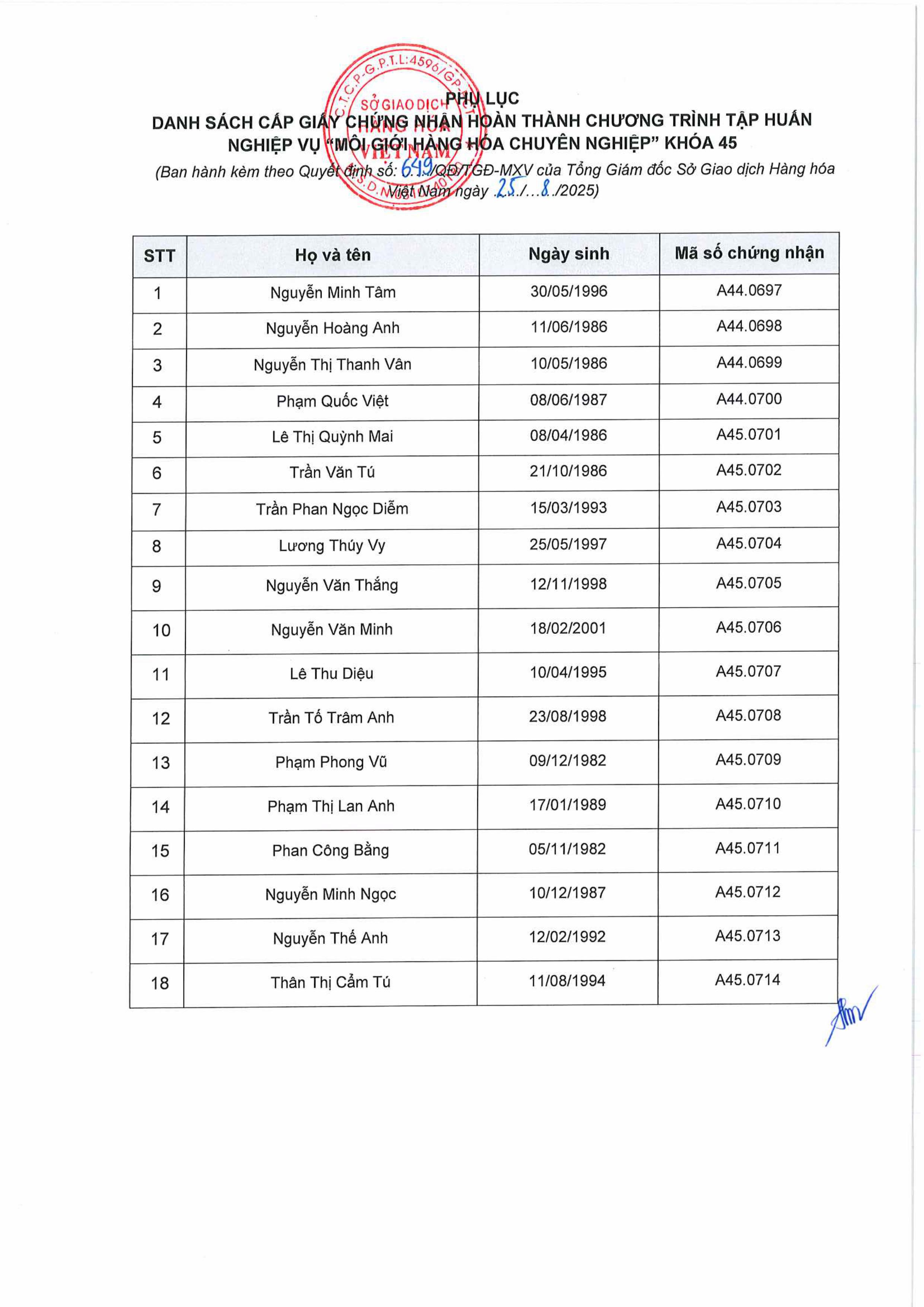QĐ CẤP CHỨNG NHẬN TẬP HUẤN NGHIỆP VỤ MÔI GIỚI HÀNG HÓA KHÓA 44, 45
