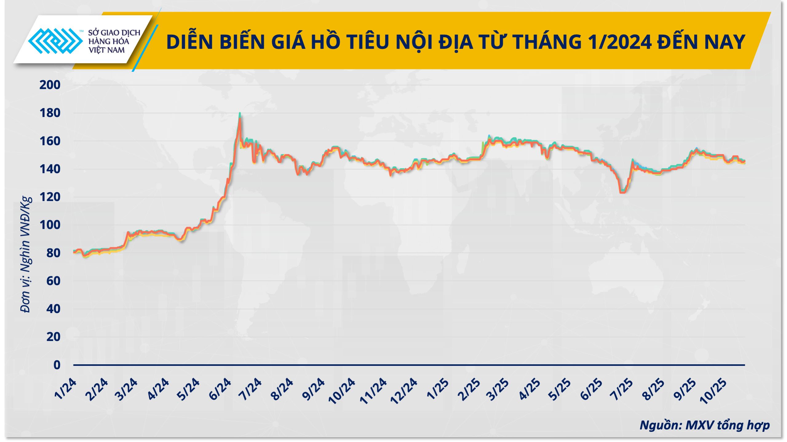 Từ quý II/2024, thị trường hồ tiêu Việt Nam bước vào chu kỳ tăng giá mạnh. Theo tính toán của Sở Giao dịch Hàng hóa Việt Nam (MXV), chỉ trong hai tháng 5 và 6, giá đã vọt hơn 50.000 đồng/kg, đạt đỉnh giữa tháng 6 khi cán mốc 180.000 đồng/kg - mức cao nhất trong 10 năm. Theo Hiệp hội Hồ tiêu và Cây gia vị Việt Nam (VPSA), giá hồ tiêu nội địa tăng trung bình hơn 70% chỉ trong nửa đầu năm, đánh dấu “cú sốc giá” lớn nhất trong nhiều năm qua.