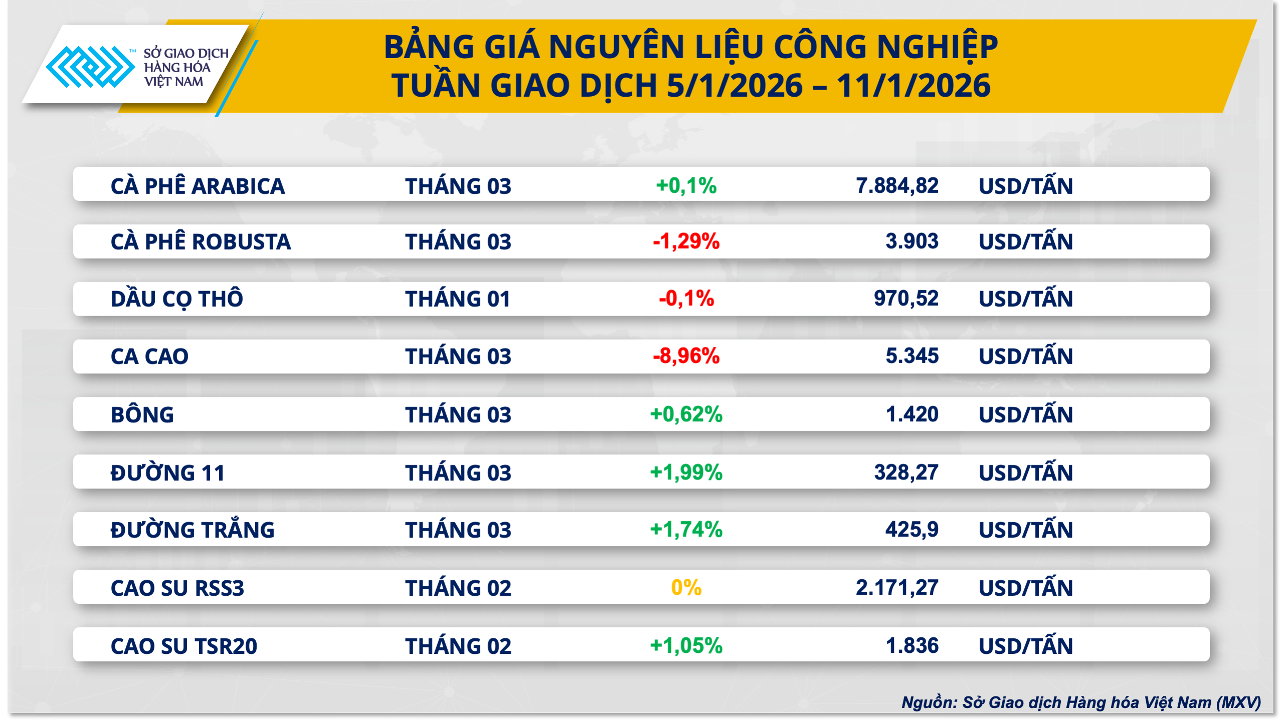 Không nằm ngoài xu hướng chung của thị trường, nhóm nguyên liệu công nghiệp cũng ghi nhận lực mua chiếm ưu thế với 5 trên 9 mặt hàng đồng loạt tăng giá. Tuy vậy, tâm điểm của thị trường đổ dồn vào hai mặt hàng cà-phê khi giá Arabica và Robusta ghi nhận những diễn biến tương đối trái chiều. Cụ thể, sau ba phiên tăng mạnh đầu tuần, giá cà-phê Arabica đã bất ngờ lao dốc, xóa sạch toàn bộ đà tích lũy trước đó. Đóng cửa tuần, hợp đồng Arabica giao tháng 3 giao dịch quanh mức 7.885 USD/tấn, tăng nhẹ 0,1% so với tuần trước đó. Trong khi đó, giá cà-phê Robusta suy giảm nhẹ 1,29%, xuống mức 3.903 USD/tấn.