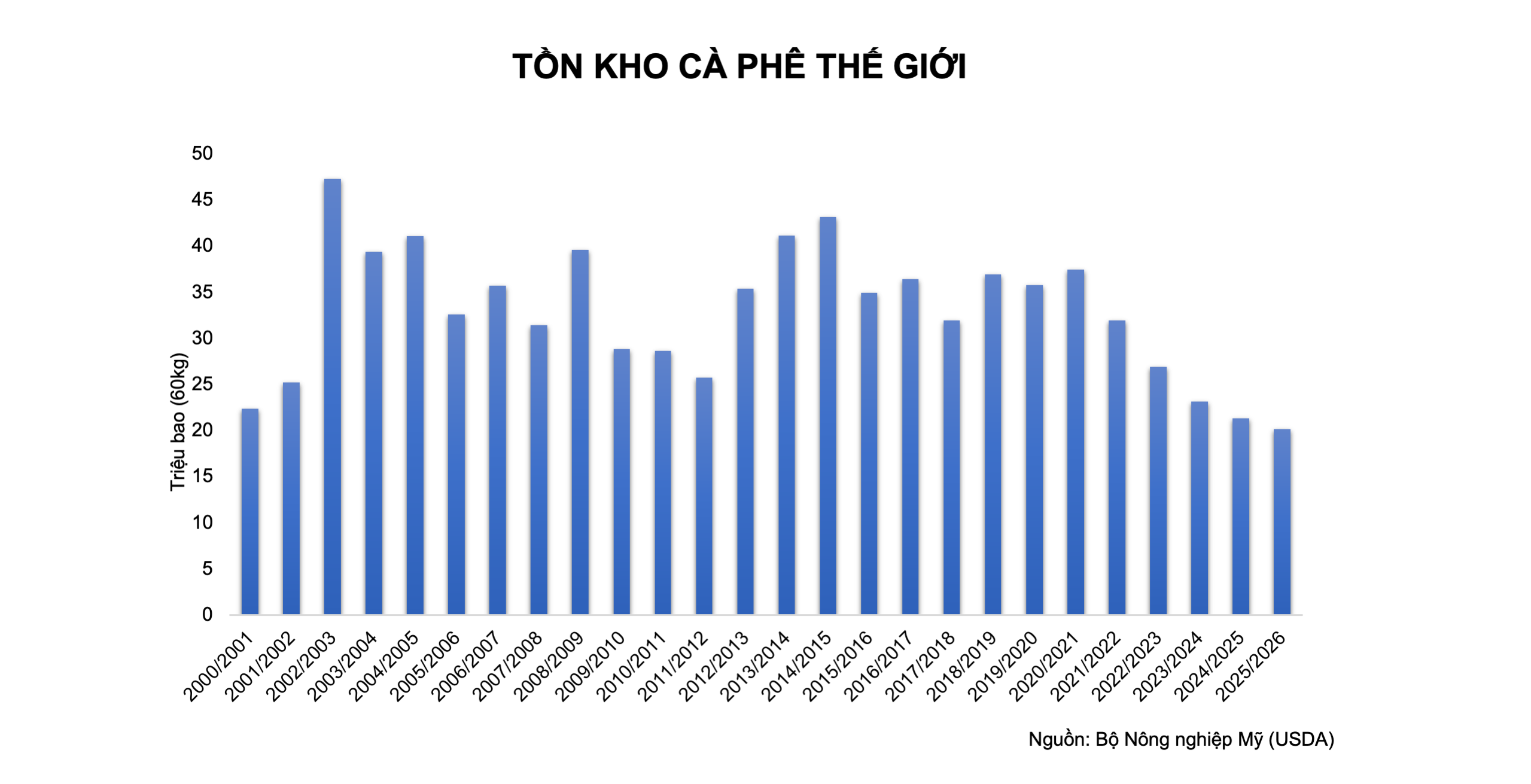 Theo MXV, yếu tố cốt lõi hỗ trợ giá cà phê hiện nay là mức tồn kho toàn cầu suy giảm mạnh. Bộ Nông nghiệp Mỹ (USDA) cho biết, tồn kho cà phê thế giới niên vụ 2025-2026 đã xuống mức thấp nhất trong vòng 25 năm. Lượng Arabica lưu kho tại sàn ICE Mỹ giảm 35,7% so với cùng kỳ năm ngoái, trong khi tồn kho Robusta cũng chạm mức thấp nhất trong 16 tháng.