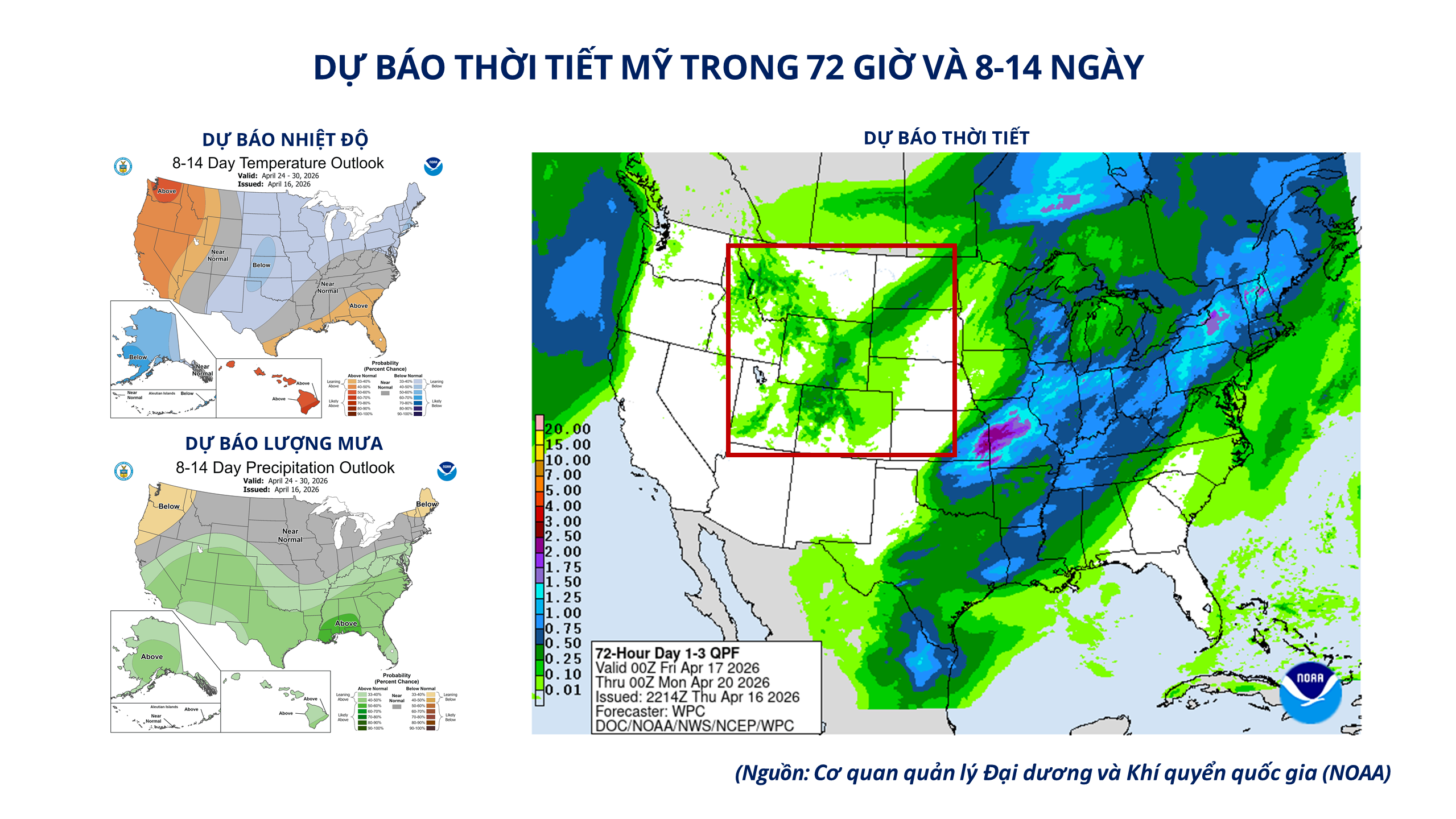Tại Mỹ, tình trạng hạn hán đang lan rộng tại khu vực phía Tây vùng Đồng bằng và bang Nebraska do thiếu mưa kéo dài. Đồng thời, các cảnh báo cho thấy nhiệt độ có thể giảm xuống dưới 0°C tại miền Tây Kansas - khu vực trồng lúa mì vụ đông trọng điểm. Trong giai đoạn cây trồng phát triển nhanh, nguy cơ sương giá có thể gây thiệt hại trực tiếp đến năng suất và sản lượng.
