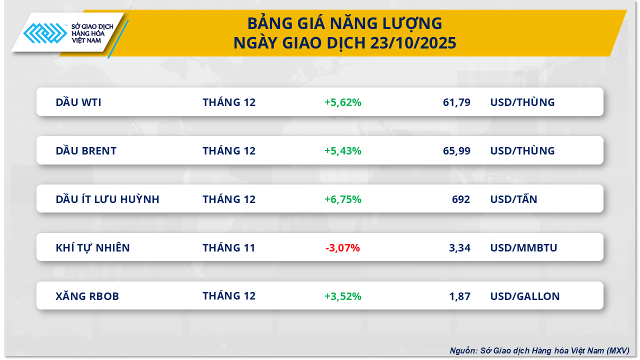 Thị trường năng lượng phiên hôm qua ghi nhận lực mua áp đảo với 4 trên 5 mặt hàng đồng loạt tăng mạnh. Nổi bật trong đó là hai mặt hàng dầu thô với mức tăng mạnh nhất kể từ tháng 6 vừa qua. Cụ thể, giá dầu WTI trong phiên hôm qua đã tăng vọt 5,43%, lên mức 61,79 USD/thùng, đánh du lần đầu tiên quay trở lại trên ngưỡng 60 USD/thùng kể từ ngày 9/10. Tương tự, giá dầu Brent cũng nằm trong đà tăng của thị trường khi chạm mốc 65,99 USD/thùng - mức cao nhất trong hai tuần trở lại đây, tương đương mức tăng khoảng 5,62%.