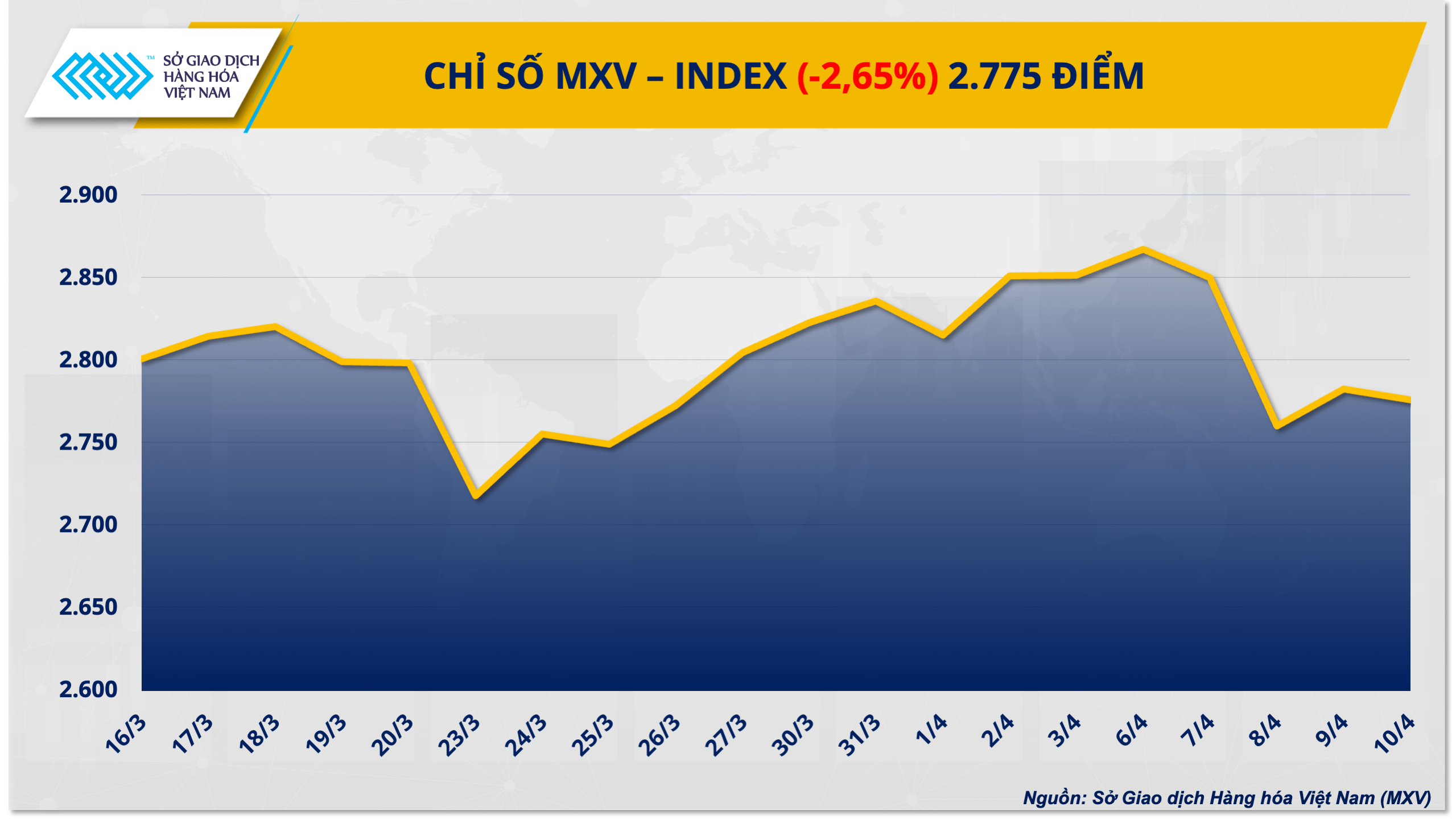 Thị trường hàng hóa nguyên liệu thế giới trải qua tuần giao dịch đầy biến động (6-10/4) khi lực bán gia tăng mạnh, đặc biệt tại nhóm năng lượng. Trước áp lực điều chỉnh lan rộng, chỉ số MXV-Index đóng cửa tuần giảm 2,65% xuống 2.775 điểm, đánh mất ngưỡng 2.800 sau gần hai tuần neo giữ.