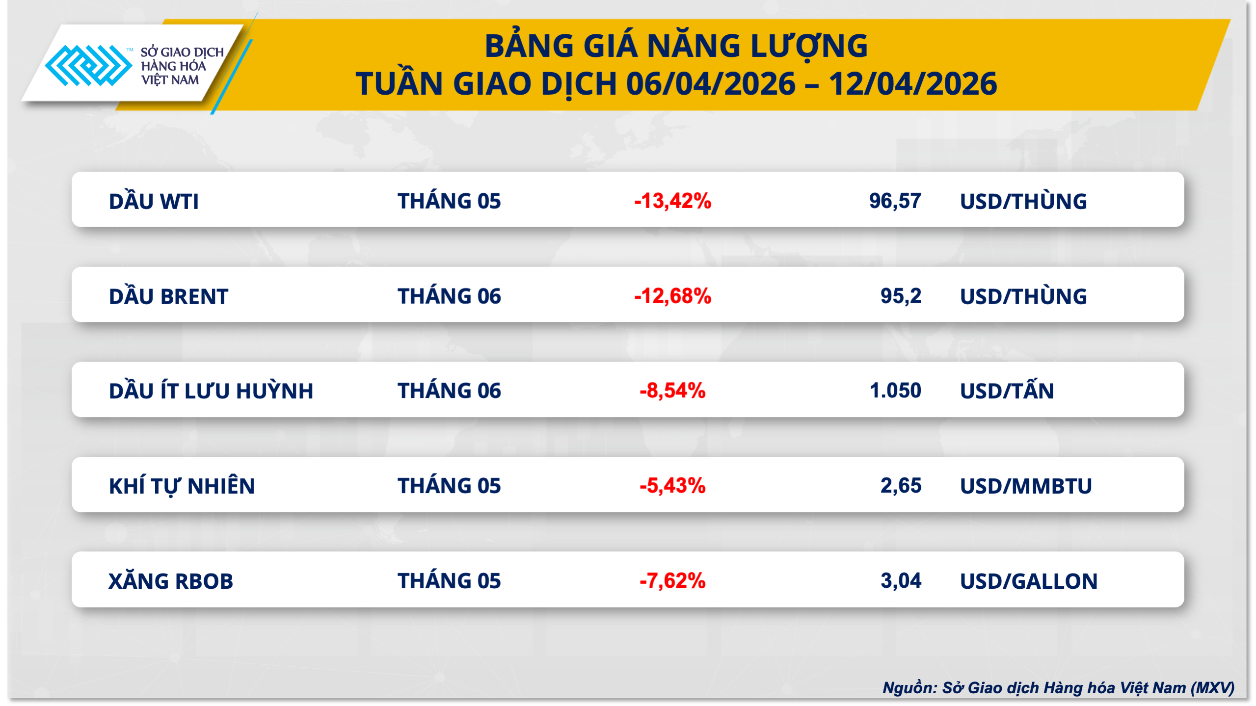 Theo Sở Giao dịch Hàng hóa Việt Nam (MXV), nhóm năng lượng trở thành tâm điểm giảm giá của thị trường hàng hóa nguyên liệu thế giới trong tuần qua khi áp lực bán áp đảo trên toàn bộ 5 mặt hàng. Đáng chú ý, giá dầu thô lao dốc mạnh, trở thành lực kéo chính khiến cả nhóm chìm sâu trong sắc đỏ.
