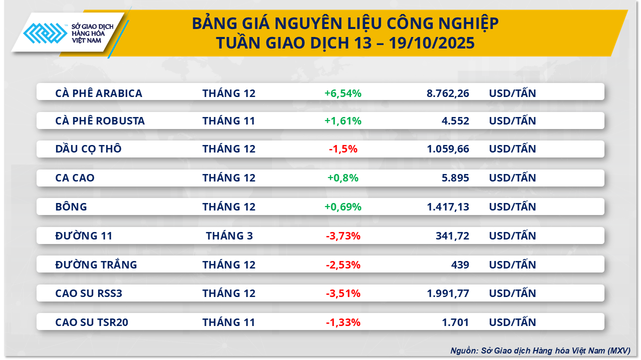 Theo Sở Giao dịch Hàng hóa Việt Nam (MXV), dòng tiền đã quay lại mạnh mẽ trên thị trường hàng hóa nguyên liệu trong tuần từ 13-17/10. Chỉ số MXV-Index kết tuần tăng 0,8% lên 2.248 điểm. Tâm điểm chú ý hướng về hai mặt hàng cà-phê khi giá Arabica tăng vọt hơn 6,5%, tiếp tục duy trì đà phục hồi ấn tượng và thu hút dòng vốn đầu tư trong nước lẫn quốc tế. Ngược lại, nhóm năng lượng lại trở thành lực cản chính của thị trường khi cả 5 mặt hàng chủ chốt đồng loạt giảm giá trong bối cảnh lo ngại dư cung và triển vọng nhu cầu kém tích cực.