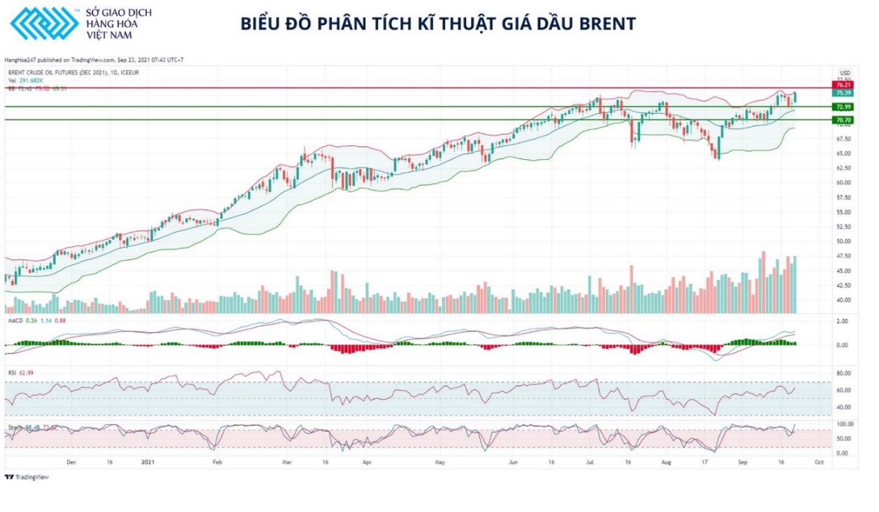 Giá dầu bật tăng mạnh mẽ khi thị trường vượt qua lo ngại từ rủi ro hệ thống trong trường hợp Tập đoàn bất động sản Evergrande phá sản. Kết thúc phiên giao dịch, WTI tăng 2.47% lên 72.23 USD/thùng, Brent tăng 2.47% lên 75.39 USD/thùng.