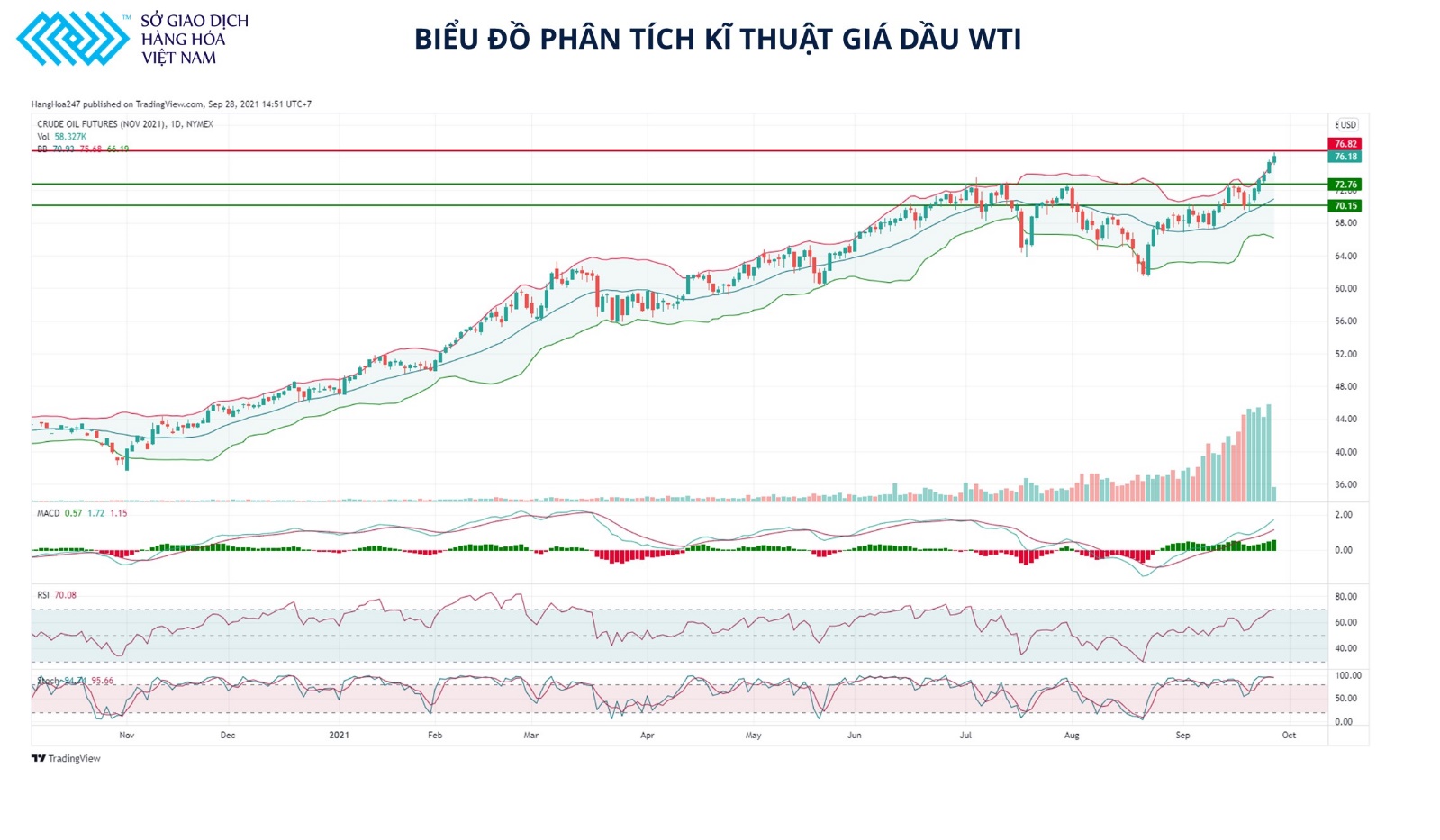 Đà tăng của khí tự nhiên kéo theo dầu tiến gần đến mốc 80 USD/thùng. Giá dầu tiếp tục tăng phiên thứ 5 liên tiếp khi lo ngại về thiếu hụt năng lượng lên cao. Kết thúc phiên giao dịch hôm qua, giá khí tự nhiên đạt đỉnh 7 năm lên 5.706 USD/MMBTu, trong khi giá WTI tăng 1.99% lên 75.45 USD/thùng, giá Brent tăng 1.93% lên 78.72 USD/thùng.
